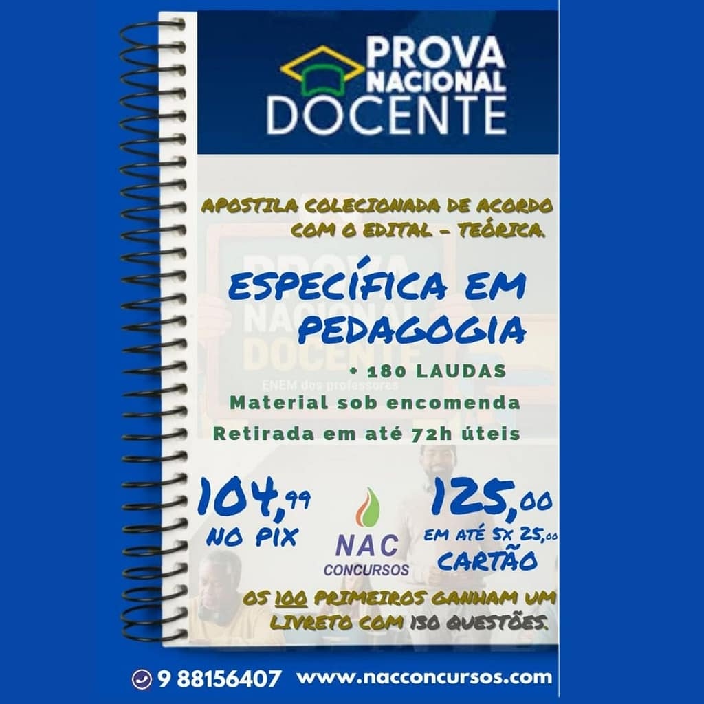 Apostila TeóricaConcurso para Professores – PND- PEDAGOGO180 LAUDAS + BÔNUS 300 QUESTÕES (ACOMPANHA LIVRETO, GRÁTIS PARA OS 100 PRIMEIROS ADQUIRENTES .